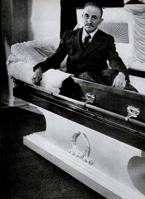 **75-летний Джим Гернхерт в своем новом гробу во время первой репетиции своих похорон, 1951 г.