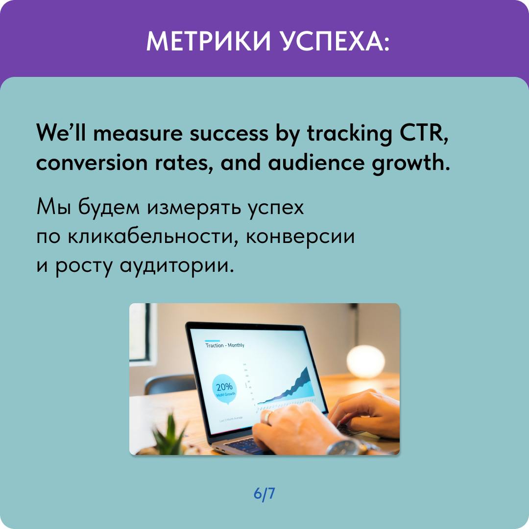 We’ll measure success by tracking CTR, conversion rates, and audience growth — Мы будем измерять успех по кликабельности, конверсии и росту аудитории.