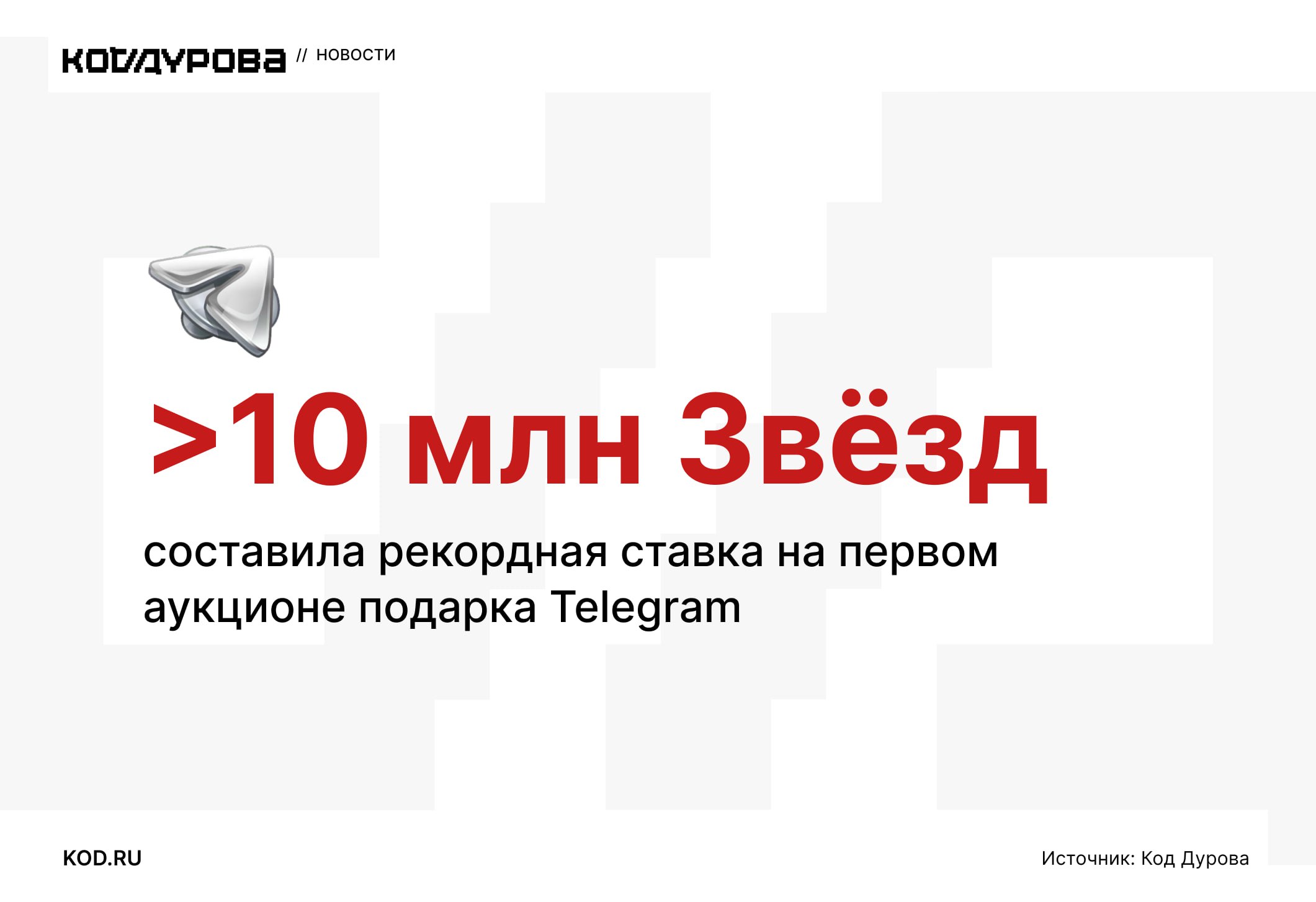 ![]() | https://t.me/d_code/24298 **🦴**** Продано!** [Первый аукцион](https://t.me/d_code/24296) в Telegram завершился — 1000 подарков Telegram Plane успешно распроданы. Вот некоторые интересные цифры: 💘 Самая высокая ставка — 10 079 524 Звезды, что эквивалентно 13,1 млн |