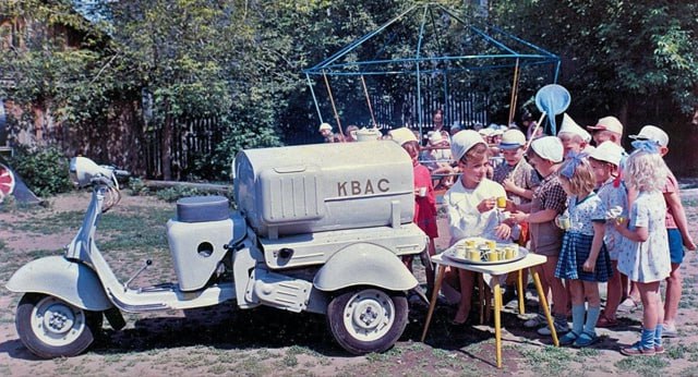Раздача кваса в детском саду с грузового трехколёсного мотороллера «Вятка» МГ-150-Ц (цистерна), 1959 год