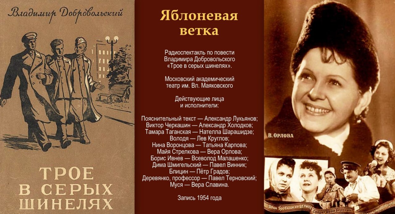 ![]() | https://t.me/sssr_history2/24794 **Советская актриса театра и кино, Народная артистка РСФСР Вера Марковна Орлова Владимир Добровольский «Яблоневая ветка».** Радиокомпозиция спектакля Московского театра им. Маяковского, поставленного по повести «Трое в серых шинелях». Орлова |
