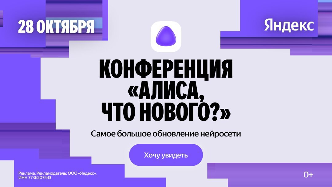 ![]() | NULL/26638 [**Что теперь умеет нейросеть Алиса? Узнайте раньше всех**](https://ya.cc/t/YpUMKBxE7sTF2r/?erid=j1SUnYT2kaFBC95ds) Яндекс анонсировал прямую трансляцию конференции «Алиса, что нового?», где будет представлено новое поколение генеративных |