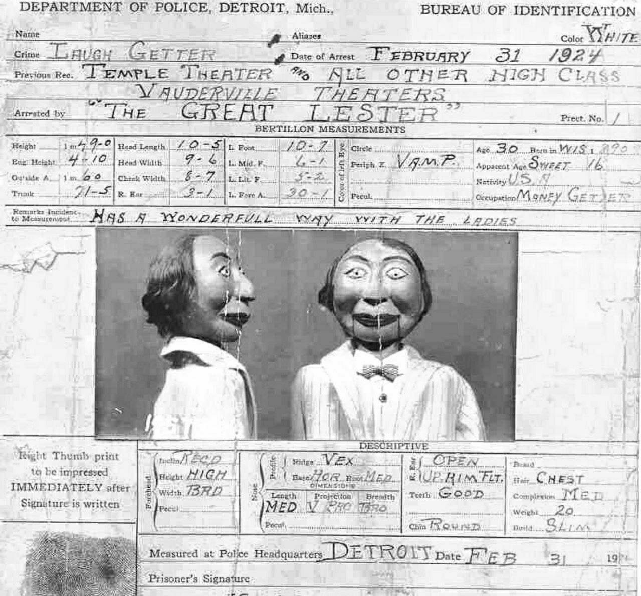 ![]() | NULL/12772 Кукла чревовещателя Лестера, обвиненная в убийстве трёх человек, США, 1924 год. Во время представления три старушки умерли от смеха. Когда приехала полиция, то очевидцы утверждали, что это говорила кукла, а губы Великого Лестера не шевелились. Вину |