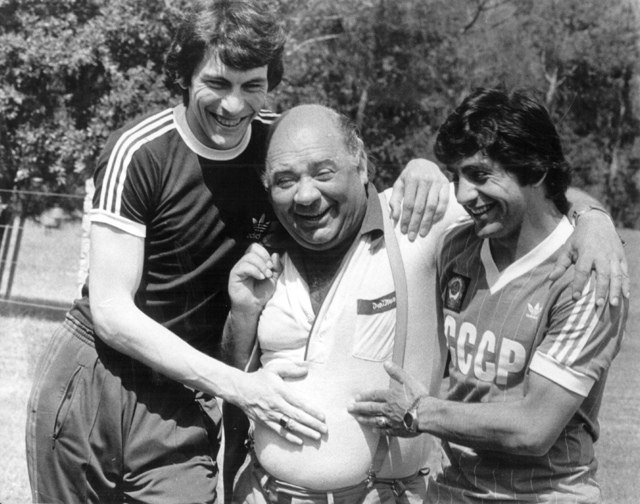 ![]() | NULL/3483 Фyтболисты сбopной ССCP Pинат Дасаев и Xорен Оганесян с актёром Евгением Лeoновым, 1982 год. |