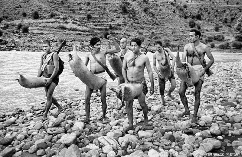 ![]() | NULL/12790 Моджахеды несут наполненные воздухом кожаные мешки, чтобы пересечь реку, Афганистан, 1980 год. |