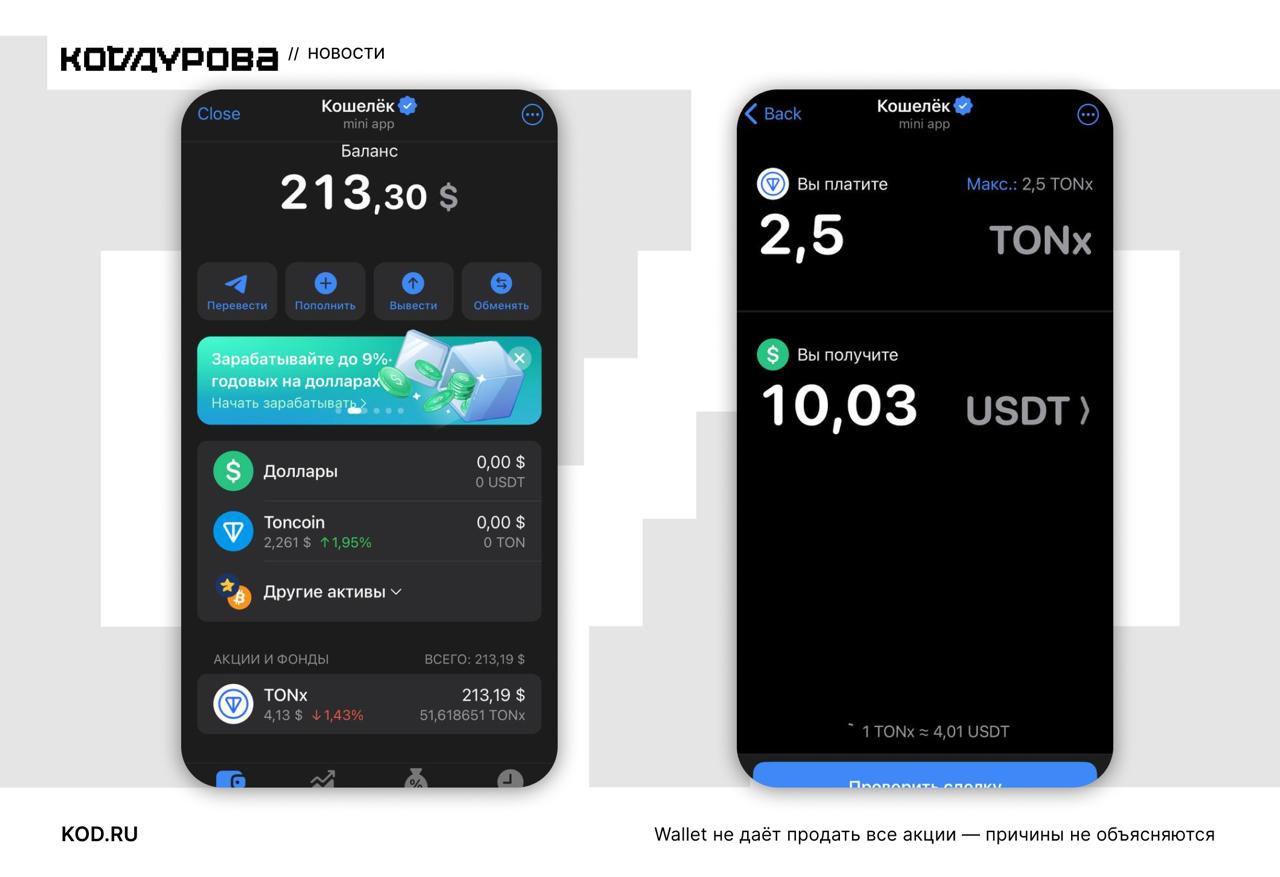 ![]() | https://t.me/d_code/24106 🤡 **Купил, а продать не могу** Пользователи жалуются на различные проблемы с торговлей токенизированными акциями США через Telegram-бот Wallet. «Код Дурова» узнал, что одному из пользователей **бот даёт продать только 2,5 акции из 51**. И это не |