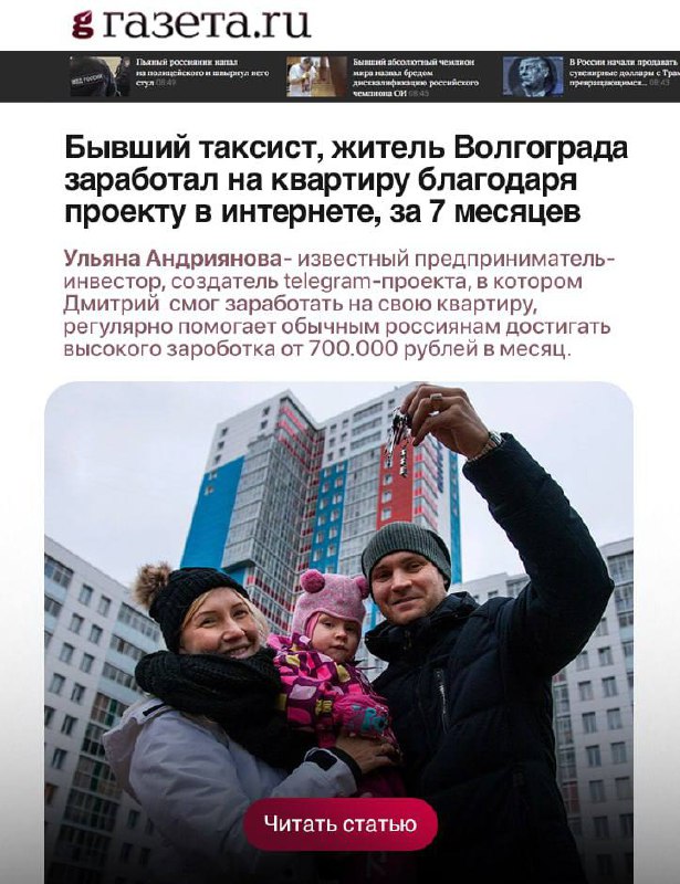 ![]() | /17134 🚕 **Бывший таксист заработал на квартиру в интернете, за 7 месяцев** 🎙**Дмитрий Селихов:** __- Раньше работал в такси всем известной компании, деньги у семьи были, но очень мало т.к. машина была в аренду. Жена домохозяйка и маленькая дочка, все |