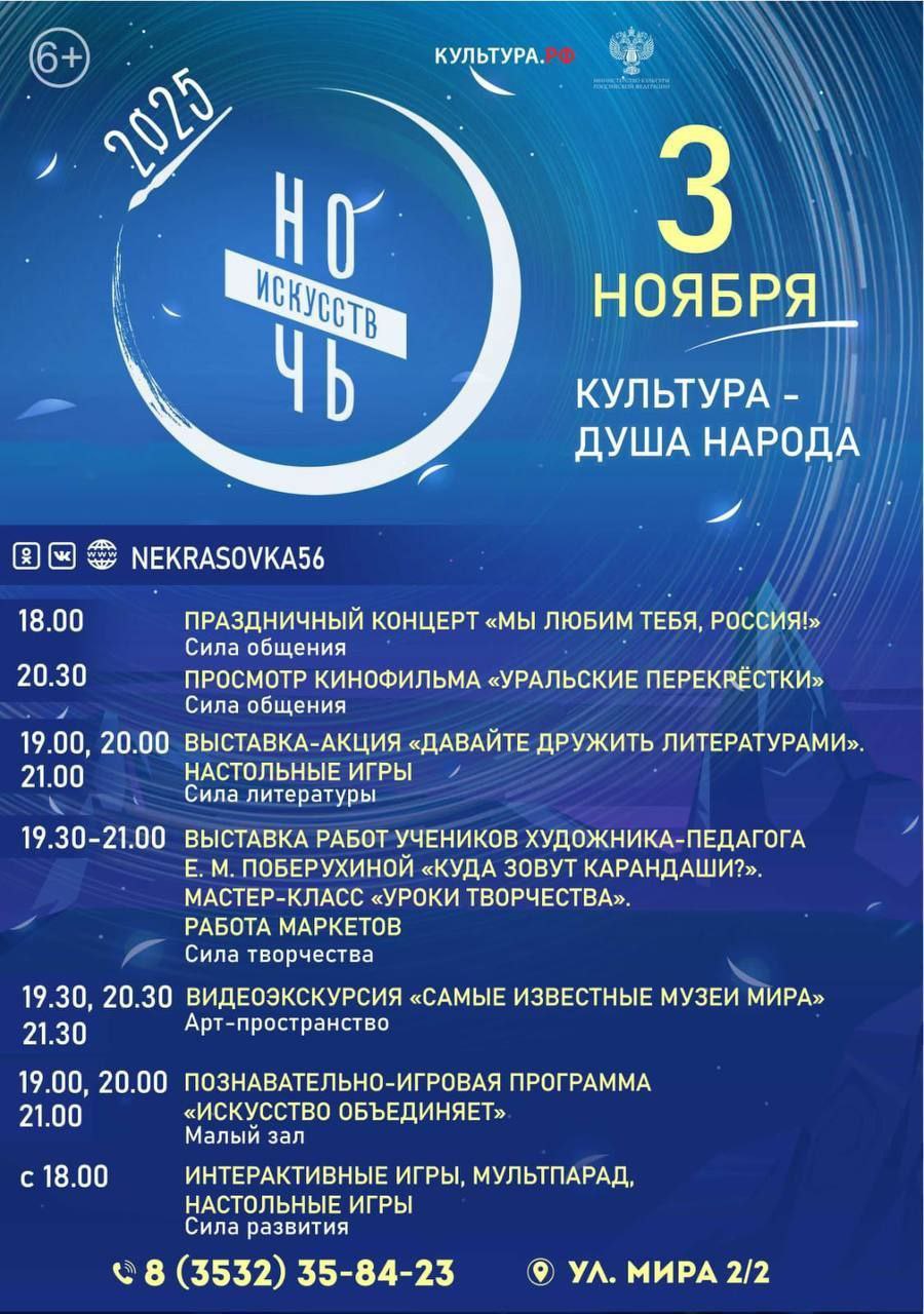 ![]() | https://t.me/orenburg_tg/59521 **Концерты, мастер-классы, игры: библиотеки Оренбурга приглашают на «Ночь искусств».** 3 ноября с 18:00 до 22:00 в рамках акции «Ночь искусств» в Центральной городской библиотеке им. Некрасова (ул. Мира, 2/2) пройдет литературно-музыкальный вечер |