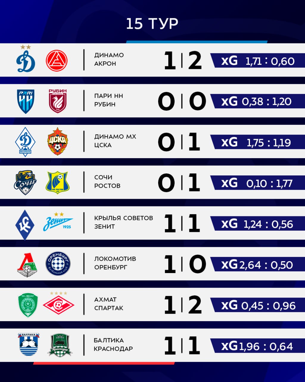 ![]() | https://t.me/premierliga/36773 Рубрика «Что там по xG?» врывается в ваш вечер 🌪 🔹 Лучший в 15-м туре — «Локомотив», только железнодорожникам покорилась отметка в 2+ ожидаемых гола 🔹 Близко подобралась «Балтика» с 1,96 xG 🔹 Самый низкий показатель у «Сочи» — лишь 0,1 ожидаемого |