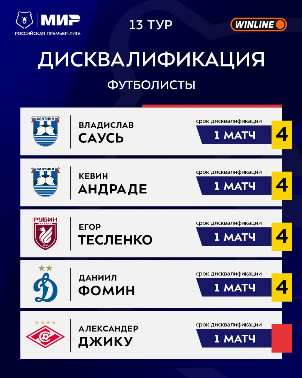 ![]() | https://t.me/premierliga/36237 Пять игроков пропустят 13-й тур #МирРПЛ из-за дисквалификаций ❌ |