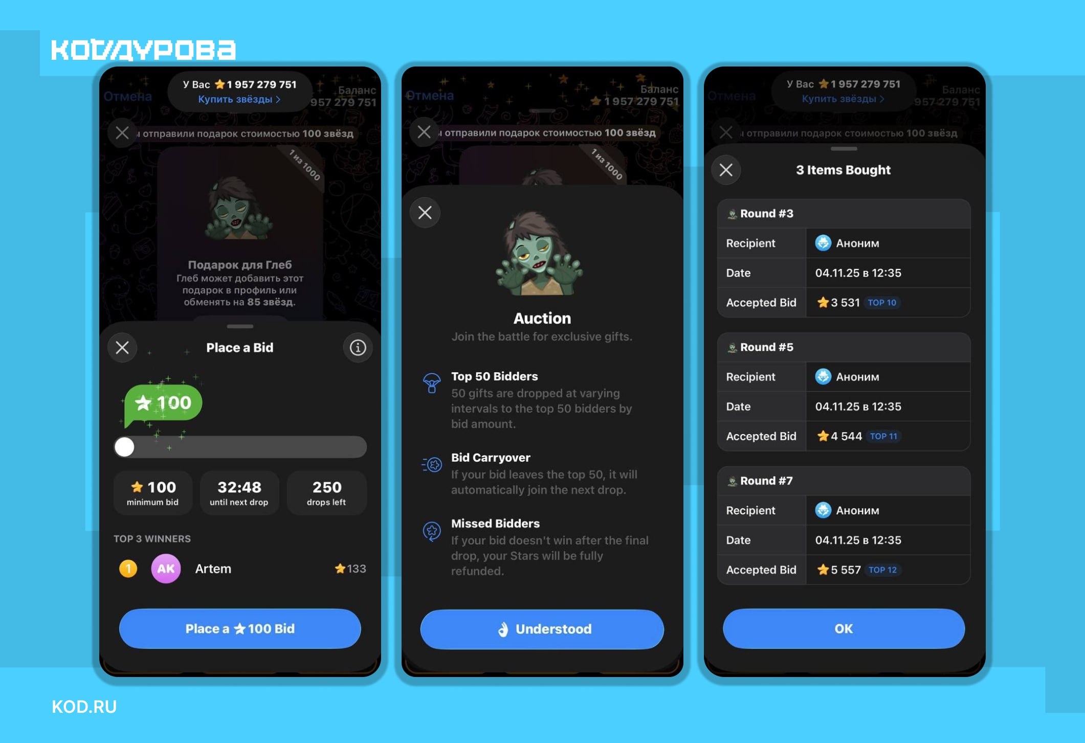 ![]() | https://t.me/d_code/24173 😄 **Аукцион подарков** В бета-версии Telegram обнаружили аукцион при покупке новых подарков. Что известно: 💘 Теперь подарки будут продаваться в формате аукциона пачками по 50 штук. 💘 Пользователи могут делать ставки в Звёздах. Участники из Топ-50 |
