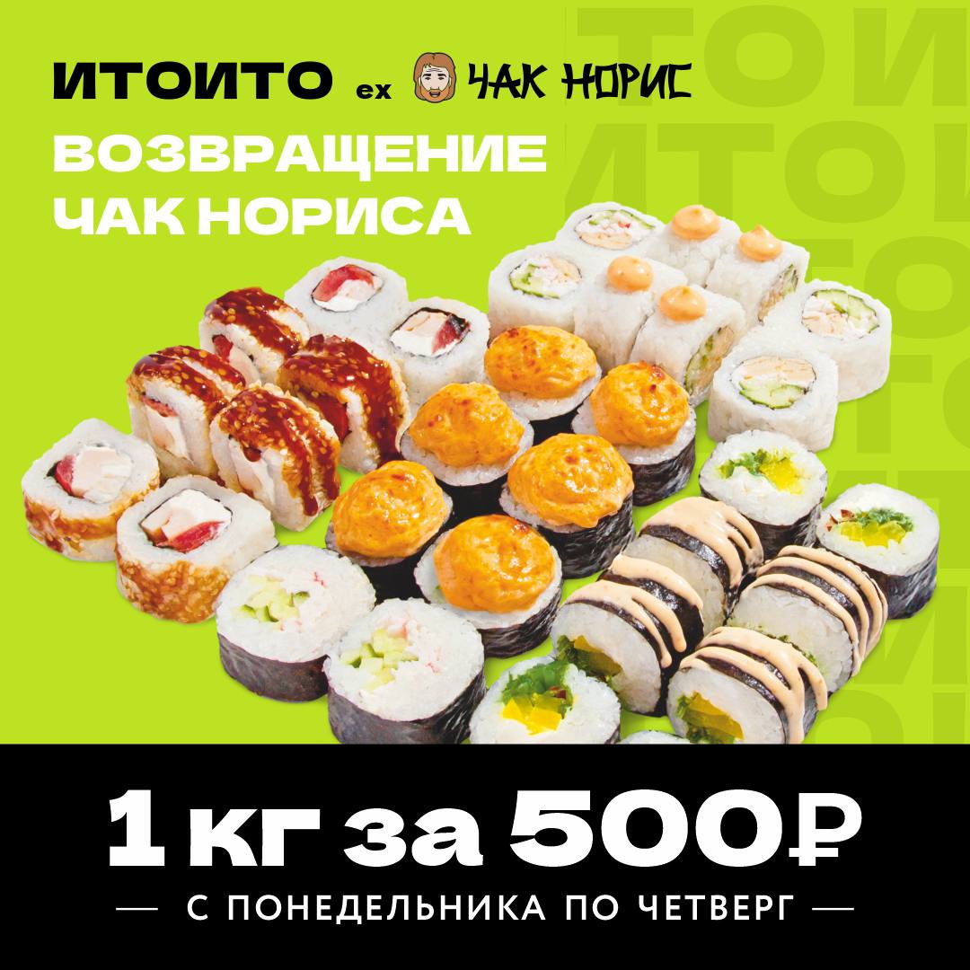 В «Ито Ито» роллы всего за 500₽. Идеально для обеда с коллегами и ужина дома! **Бесплатная доставка** в несколько районов