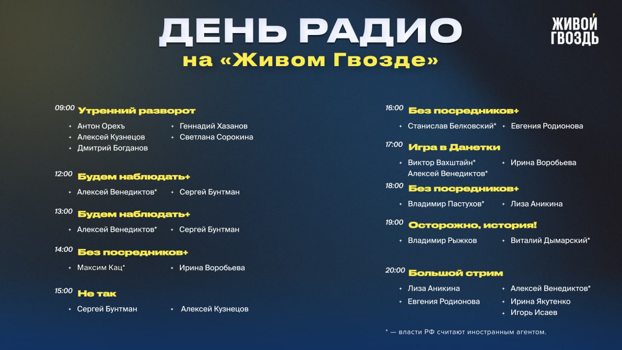 **Смотрите завтра с 9:00 на **[**YouTube**](https://www.youtube.com/@zhivoygvozd)** или в нашем Telegram-канале**!