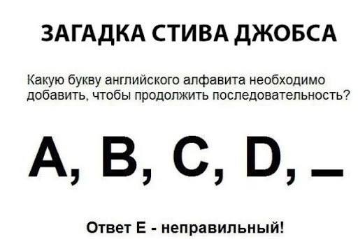 ![]() | NULL/15152 **Загадка Стива Джобса** При собеседовании, на раздумывание давалось 30 секунд, если ответ неверный - сразу уволен. [Показать ответ](https://t.me/iPumpBrain/15833) |