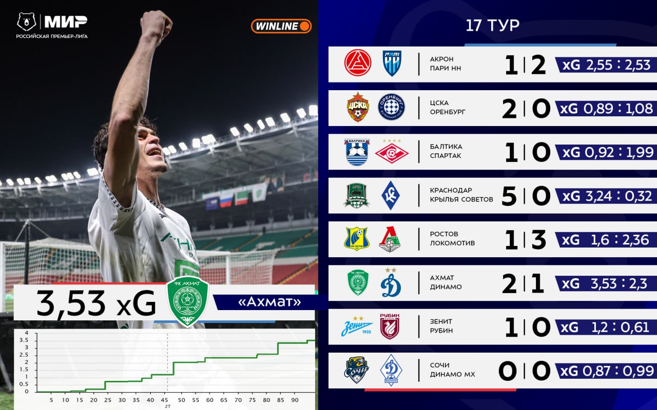 ![]() | https://t.me/premierliga/37224 Новая неделя — новый выпуск всеми любимой рубрики «Что там по xG?» от наших друзей из [Яндекс Спорттех](https://t.me/yandex_sportstat) ☺️ ▪️Самый большой показатель в туре у «Ахмата» — 3,53. Опередили даже «Краснодар»! ▪️«Акрон», «Оренбург» |