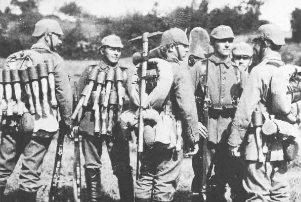 ![]() | NULL/12473 Германские штурмовики времен Первой Мировой, увешанные гранатами, как новогодние елки гирляндами. |