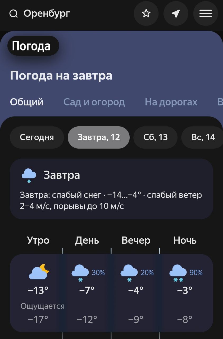 | https://t.me/orenburg_tg/62961 ❄️В пятницу в Оренбуржье пойдет снег В Оренбурге ночью -12°, днём снег и -7°. В Орске ночью -18°, днём ясно и -10°. В Бузулуке ночью -4°, днём снег с дождем и -3°. В Соль-Илецке ночью -14°, днём облачно и -7°. |