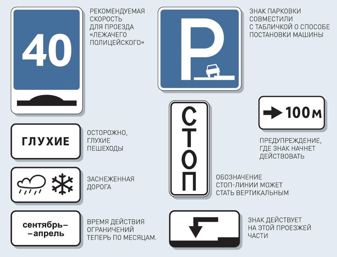 • «Рекомендуемая скорость при проезде искусственной неровности», который сократит количество знаков у «лежачих полицейских»;
