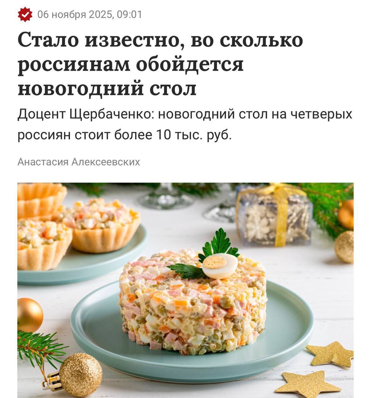 | https://t.me/orenburg_tg/59902 Новогодний стол обойдётся россиянам более чем в ₽10 тыс. на четверых, оценили финансисты. В сумму входят «Оливье», «Селёдка под шубой», две тарелки бутербродов с икрой, мясная нарезка, сыр, шампанское и мандарины. |