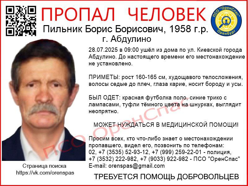 ![]() | https://t.me/orenburg_tg/59843 **Пропал человек, Пильник Борис Борисович, 1958 г.р., г. Абдулино.** 28.07.2025 в 09:00 ушёл из дома по ул. Киевской города Абдулино. До настоящего времени его местонахождение не установлено. ПРИМЕТЫ: рост 160-165 см, худощавого телосложения, волосы |