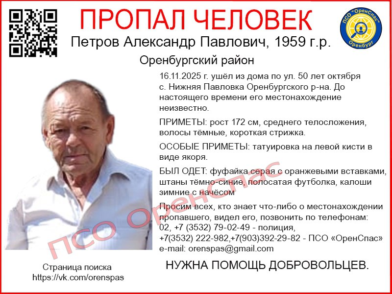 ![]() | https://t.me/orenburg_tg/61058 Пропал человек, Петров Александр Павлович, 1959 г.р. Оренбургский район 16.11.2025 г. ушёл из дома по ул. 50 лет октября с. Нижняя Павловка Оренбургского р-на. До настоящего времени его местонахождение неизвестно. ПРИМЕТЫ: рост 172 см, среднего |
