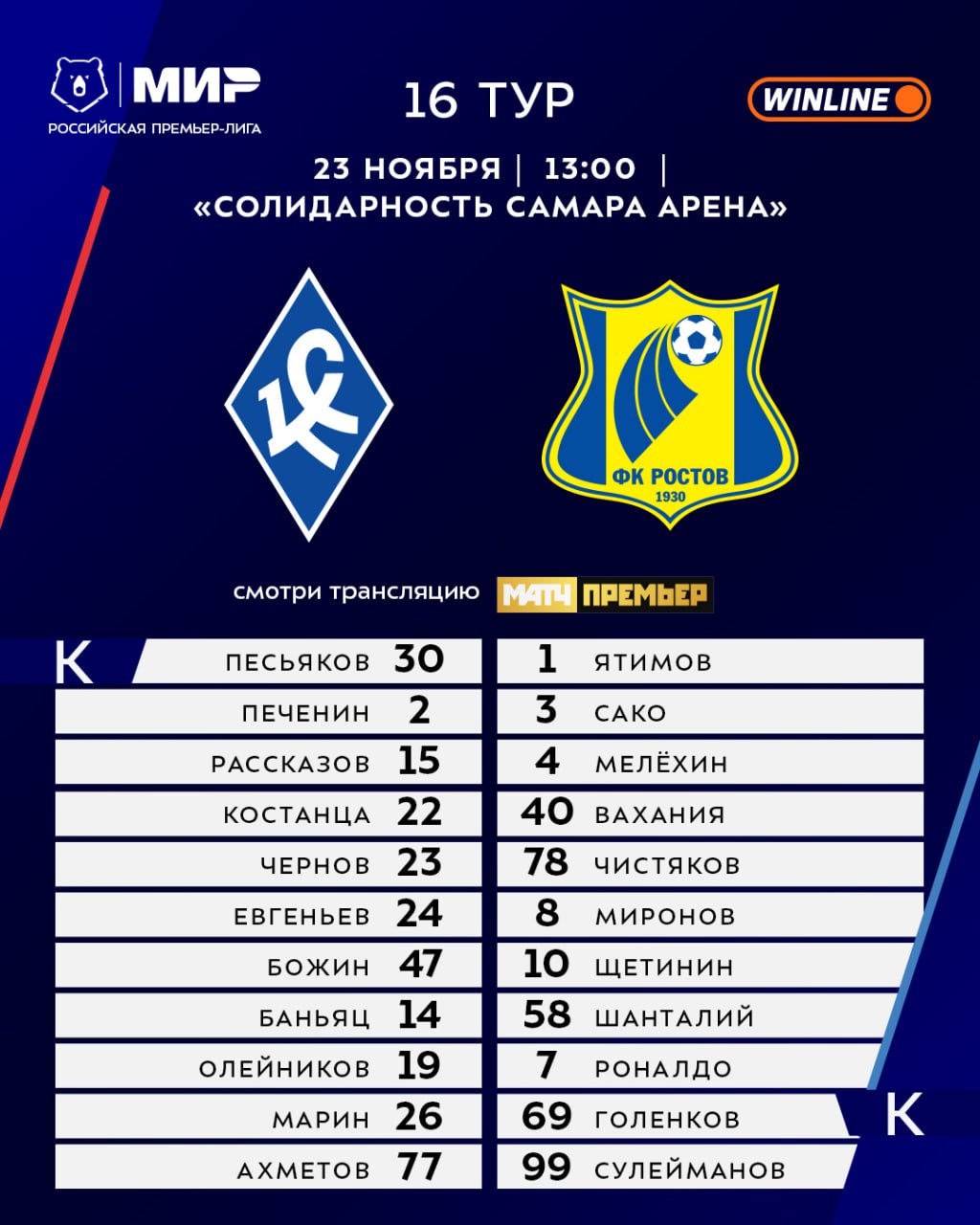 ![]() | https://t.me/premierliga/36945 Трио Олейников-Марин-Ахметов против Роналдо-Голенкова-Сулейманова — откроем игровой день матчем в Самаре 📑 Ссылка на матч [здесь](https://matchtv.ru/football/rpl/552400835-kryliasovetov-rostov-22-11-2025) 📲 #МирРПЛ #КрыльяСоветовРостов |